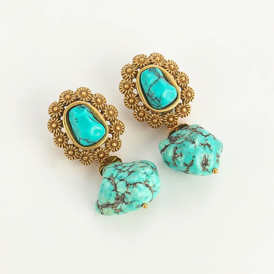 Dorella™ Vintage Floral Blue Stone Drop Earrings – Antique Gold Charm