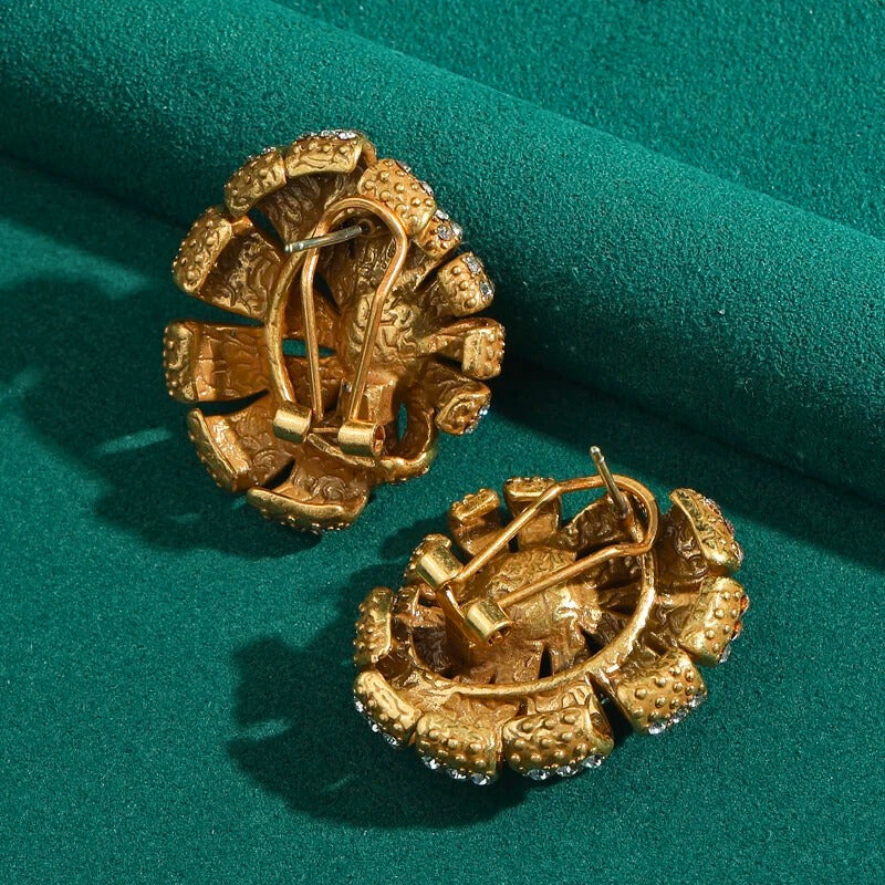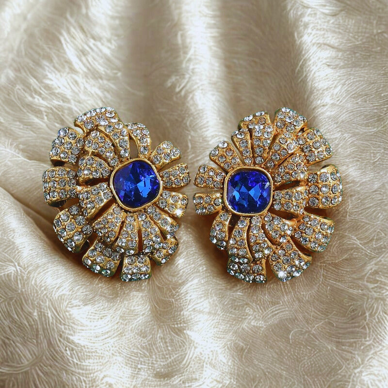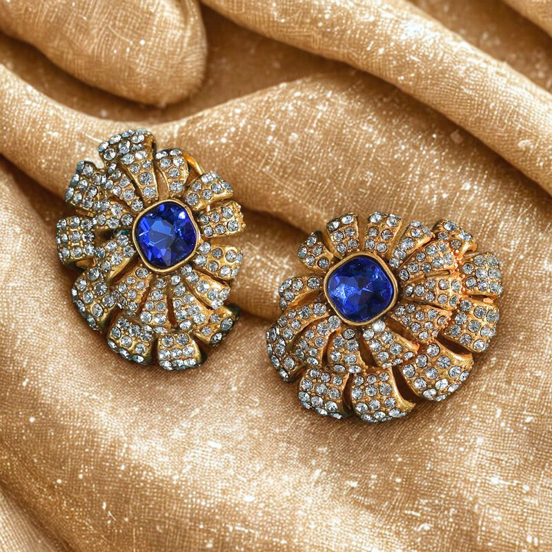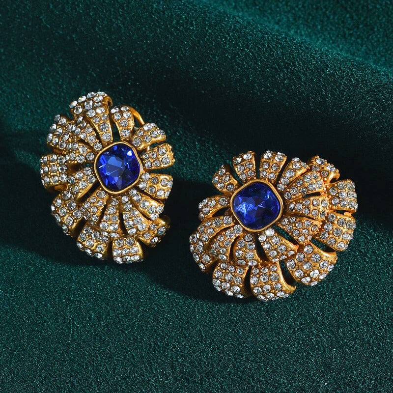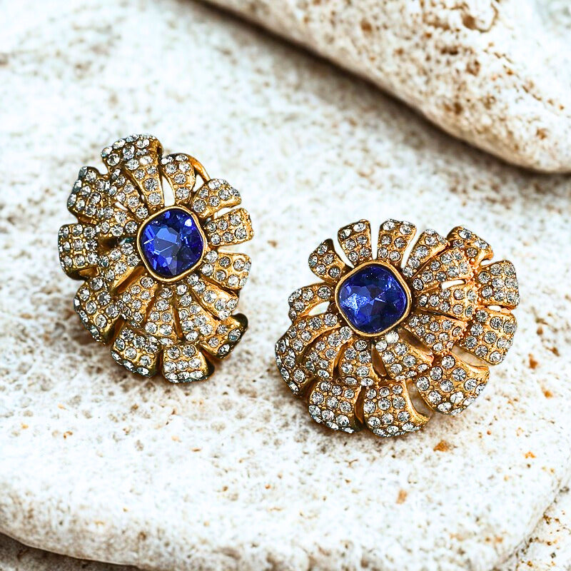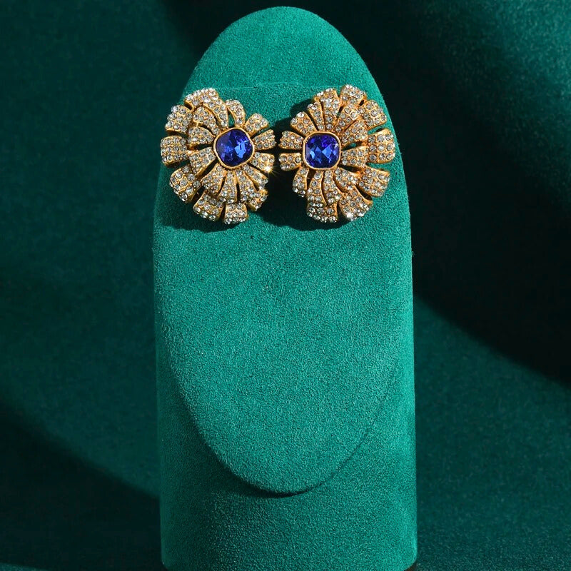 Bellvara™ Vintage Flower Stud Earrings feature dazzling blue crystals, antique gold tones, and delicate rhinestone petals—blending timeless elegance with luxurious detail for a truly captivating look.