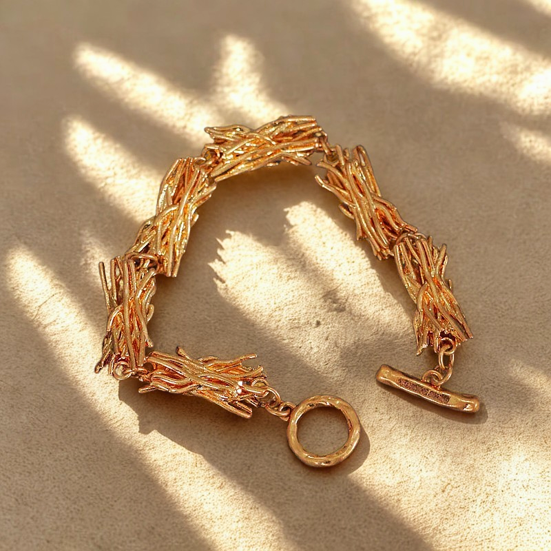 Inspired by natural textures, this gold-tone bracelet features an intricate twig-like design with a stylish toggle clasp—perfect for adding a bold, organic touch to any outfit