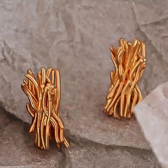 These gold-tone stud earrings feature a striking twig-inspired design, blending organic texture with modern elegance—perfect for making a subtle yet artistic statement in any setting