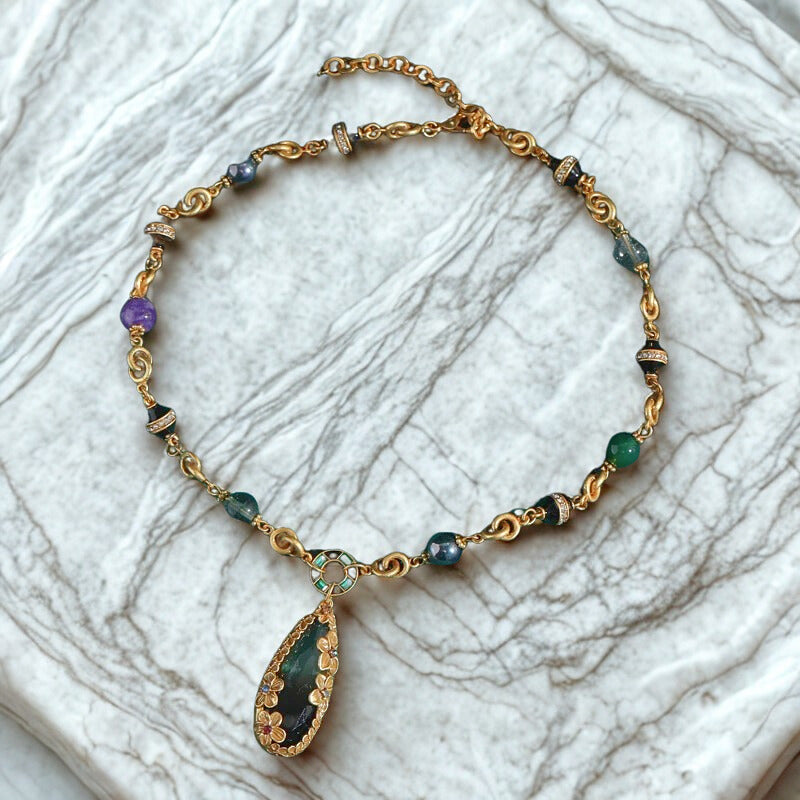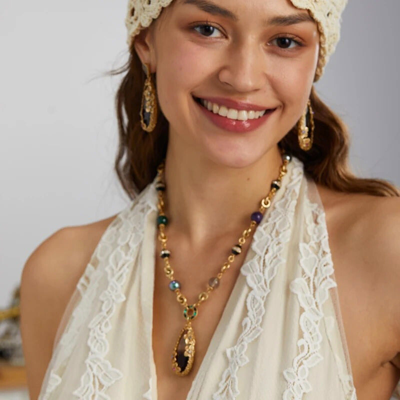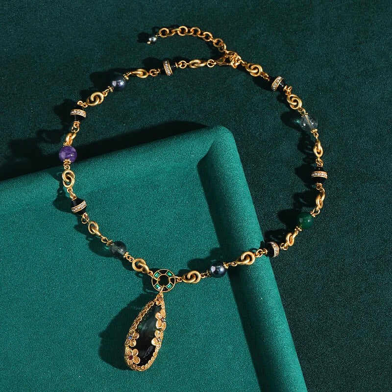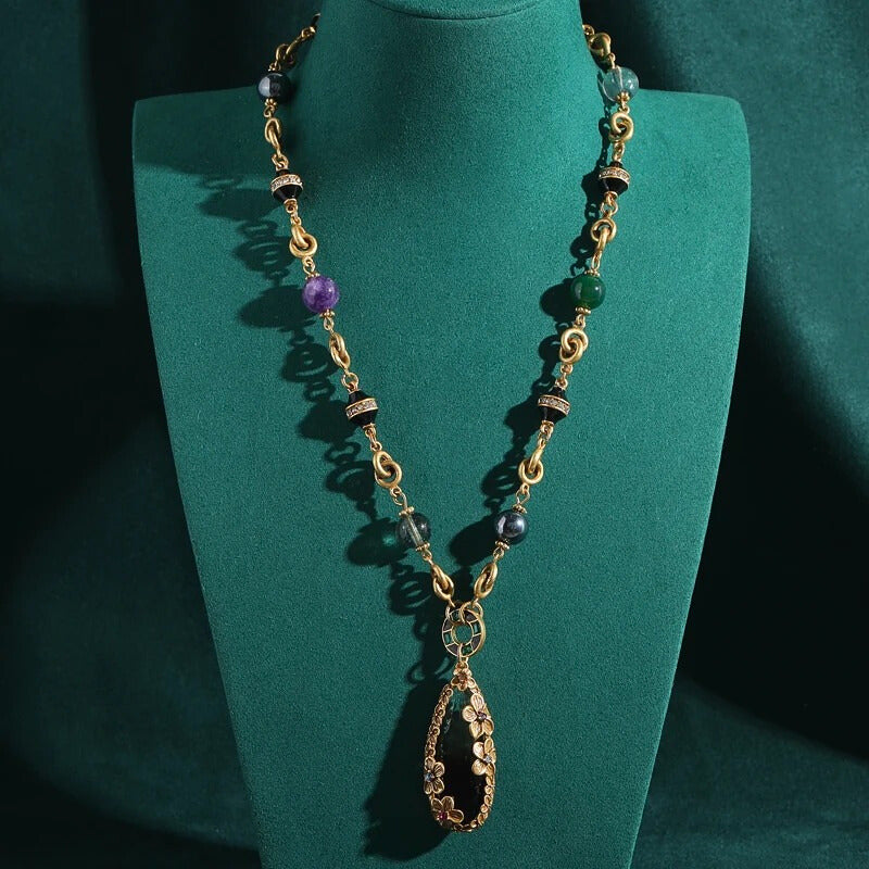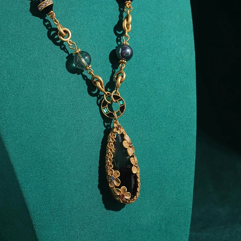 Caflora™ Vintage Crystal Blossom Pendant Necklace features a coffee-hued teardrop crystal, delicate peach blossom relief, and antique detailing—offering timeless charm and a warm, romantic glow for any occasion.
