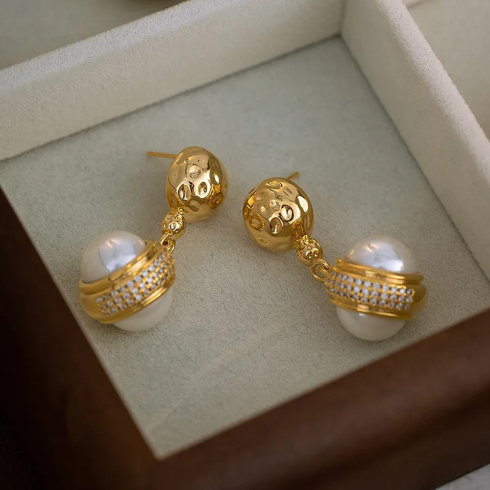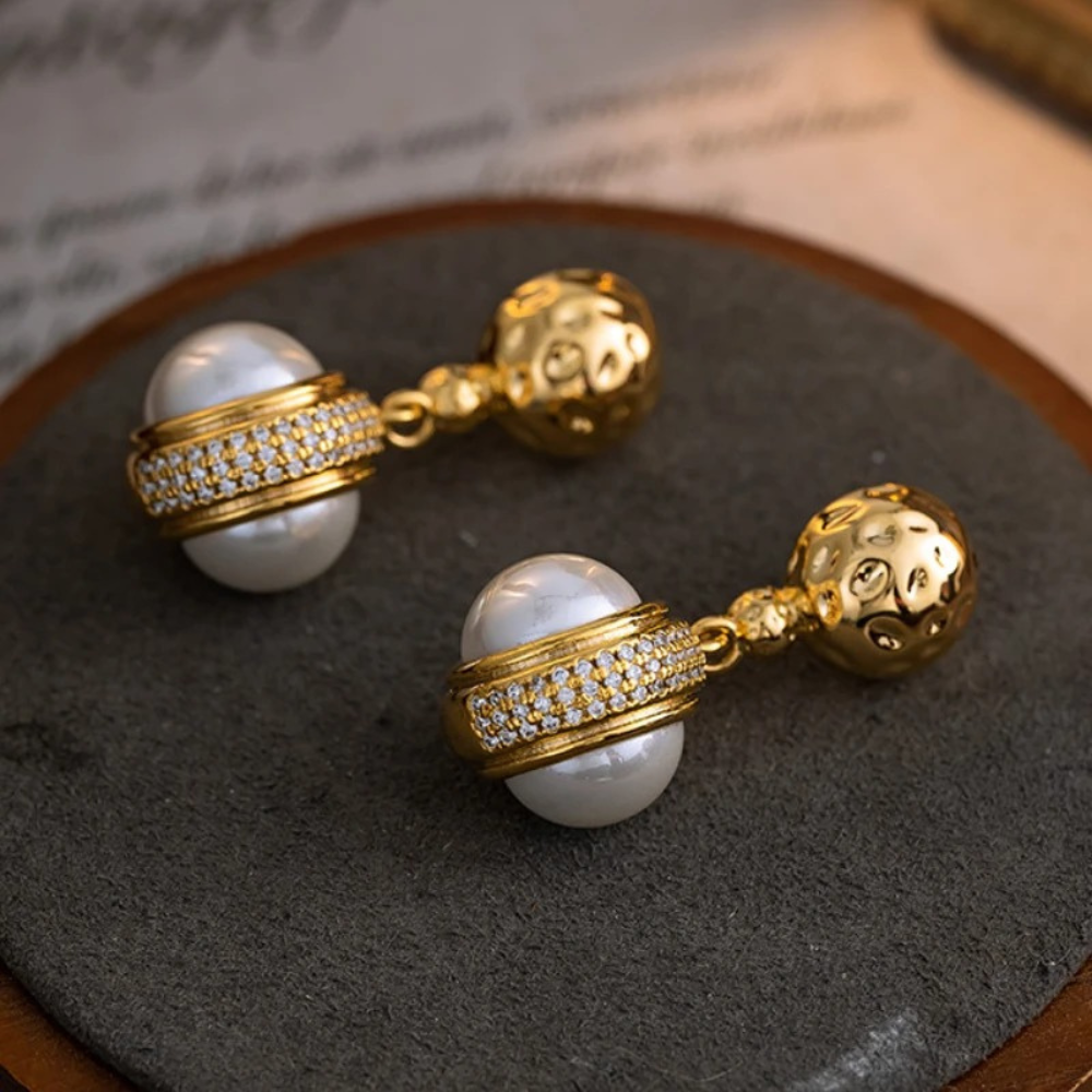 Elegant and eye-catching, these gold-tone drop earrings feature textured studs and dazzling pearl-like orbs encircled by shimmering crystals—perfect for adding a luxurious touch to any outfit, day or night.