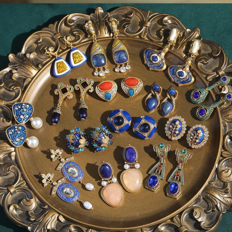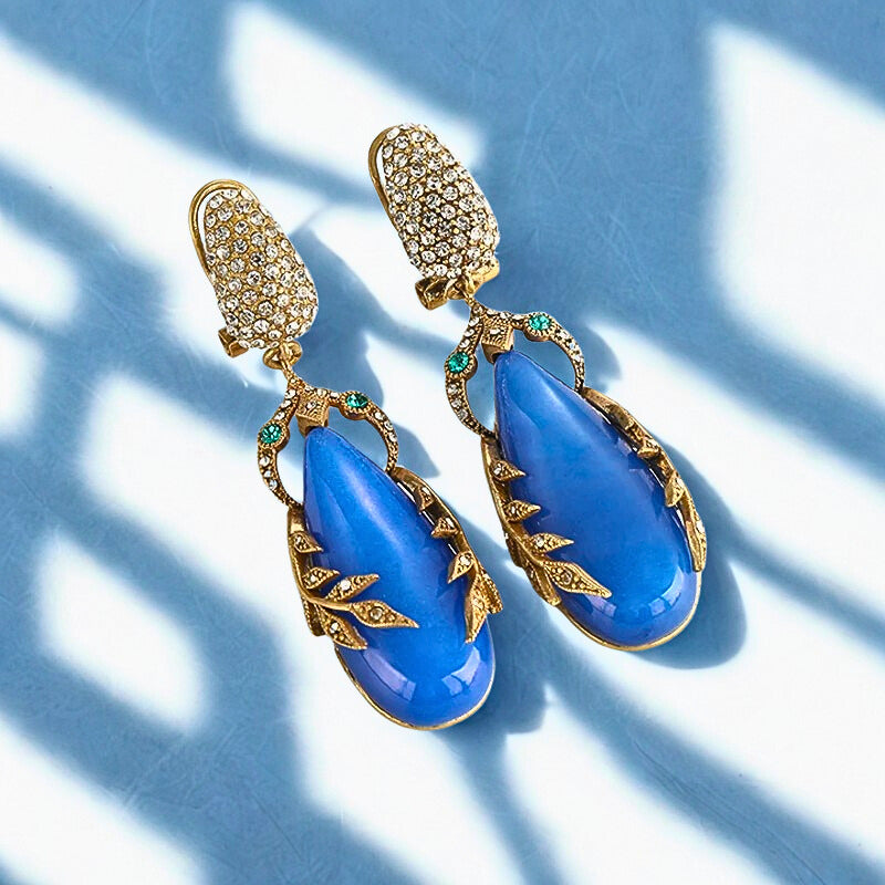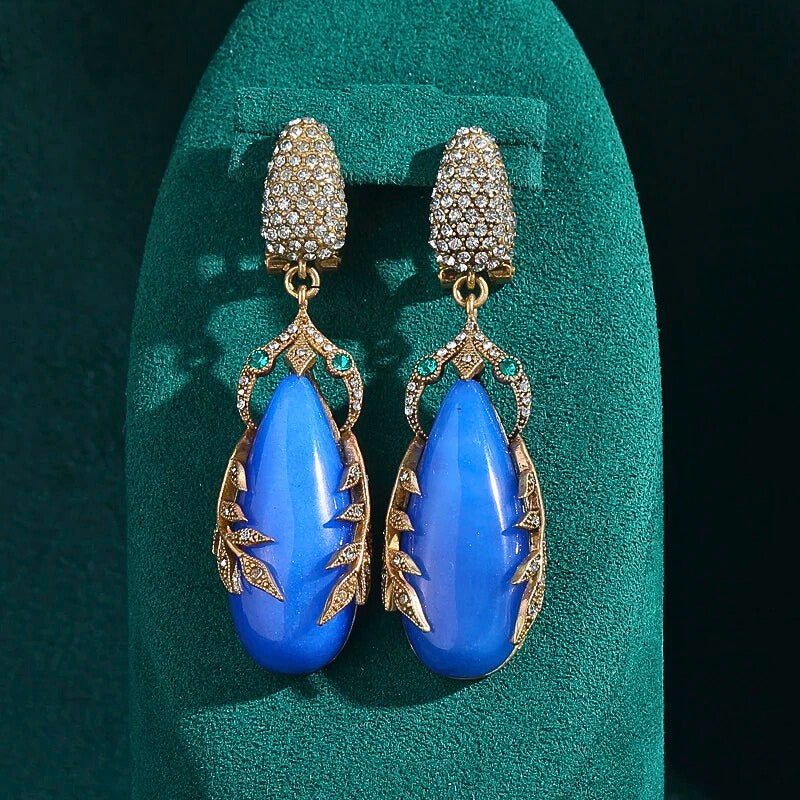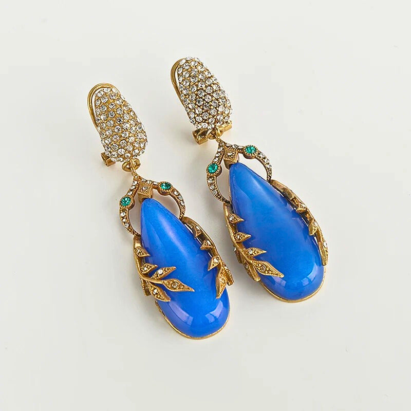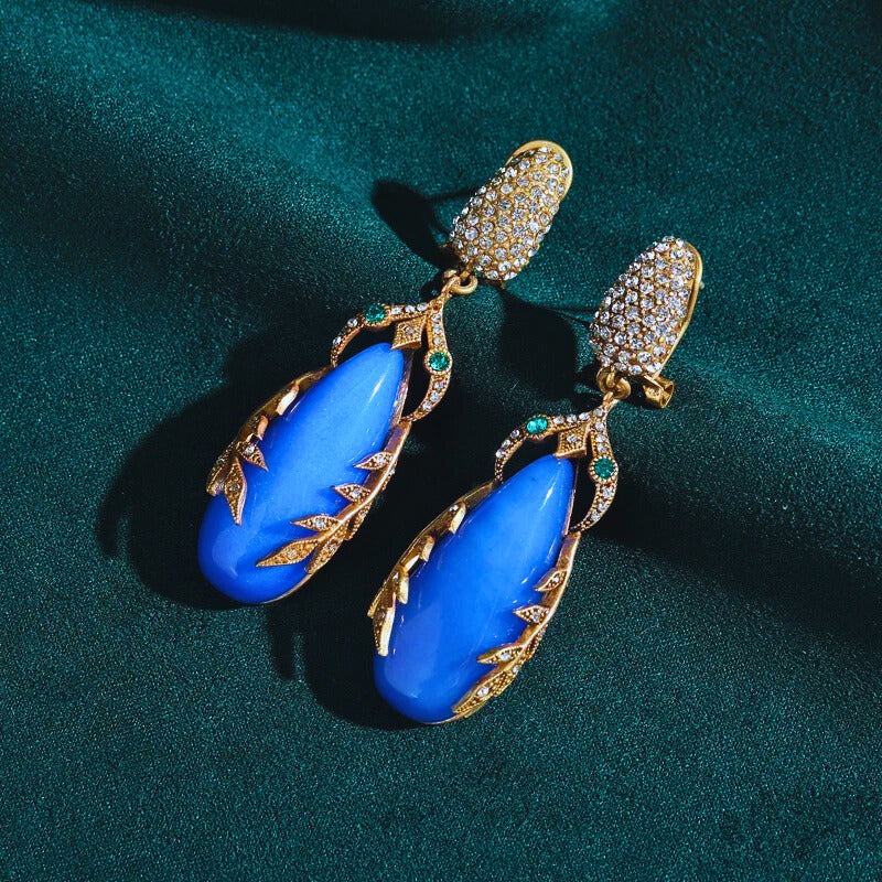 Jazmira™ Vintage Blue Teardrop Statement Earrings feature shimmering rhinestones, elegant waterdrop-shaped natural stones, and an antique gold finish-adding timeless sophistication and vibrant charm to any feminine look.