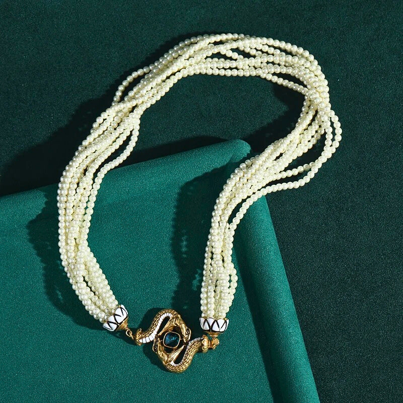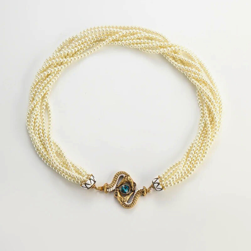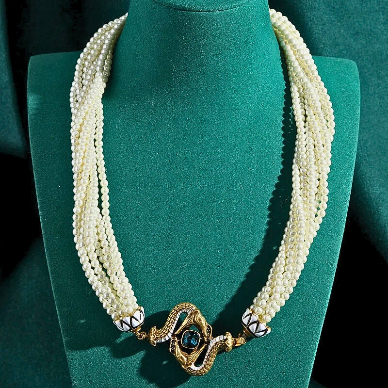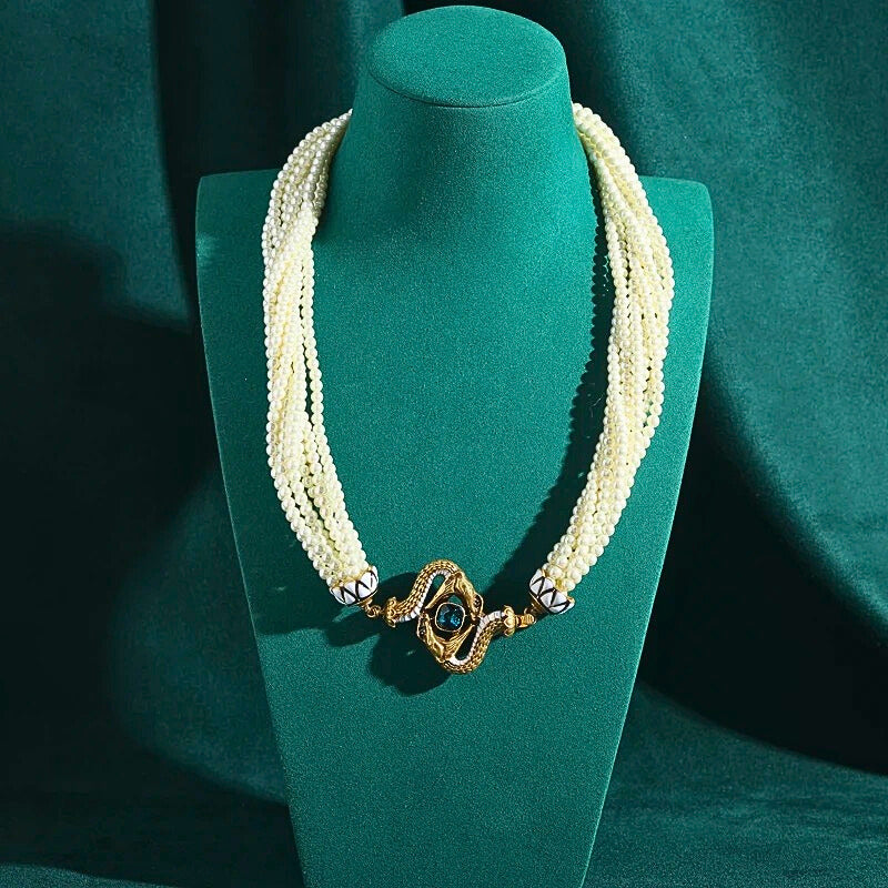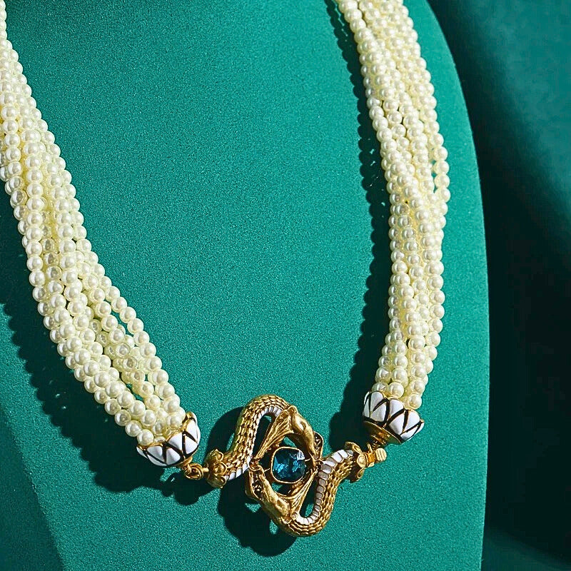 Lunavine™ Antique Gold Snake Pendant Pearl Necklace blends antique gold tones, shimmering pearls, and a bold snake pendant with blue crystal accents—perfect for statement-making elegance and mystical allure.