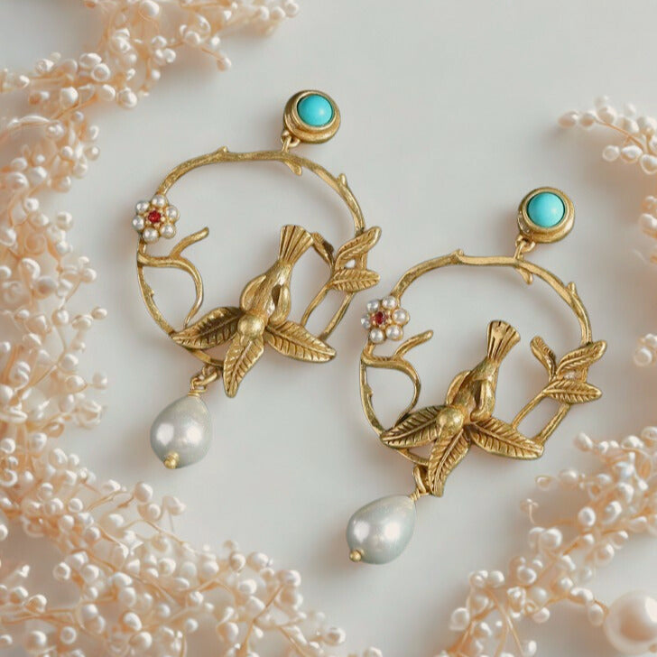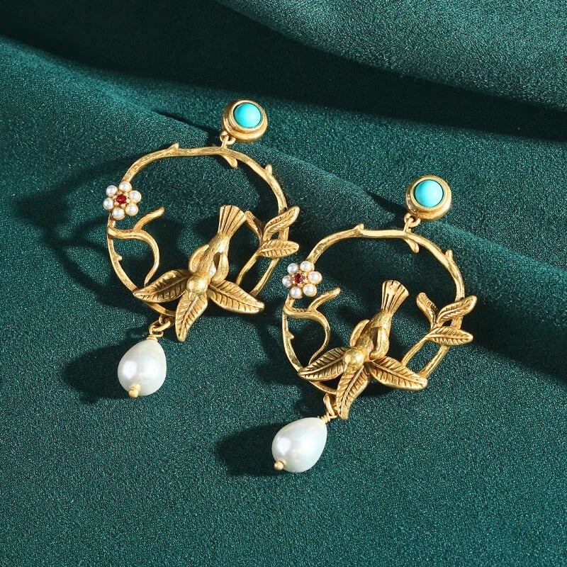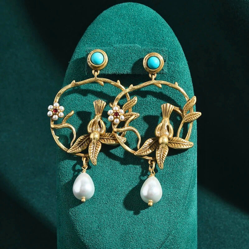 Melivora™ Baroque Pearl Drop Earrings feature natural freshwater pearls, antique gold branches, and a delicate bird motif—blending vintage charm with luxurious craftsmanship for a timeless, feminine statement.
