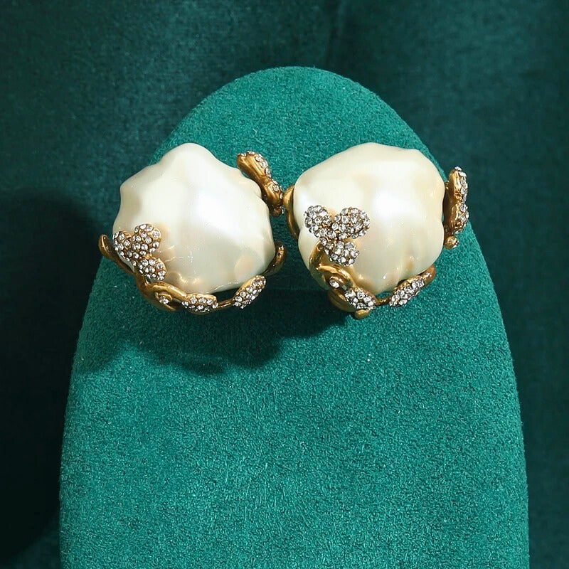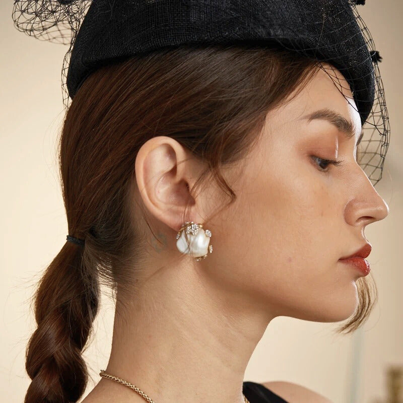 Meralune™ Baroque Pearl Drop Earrings feature luminous natural freshwater pearls in a vintage gold setting. Their bold, elegant design adds timeless luxury to bridal wear or sophisticated evening looks.