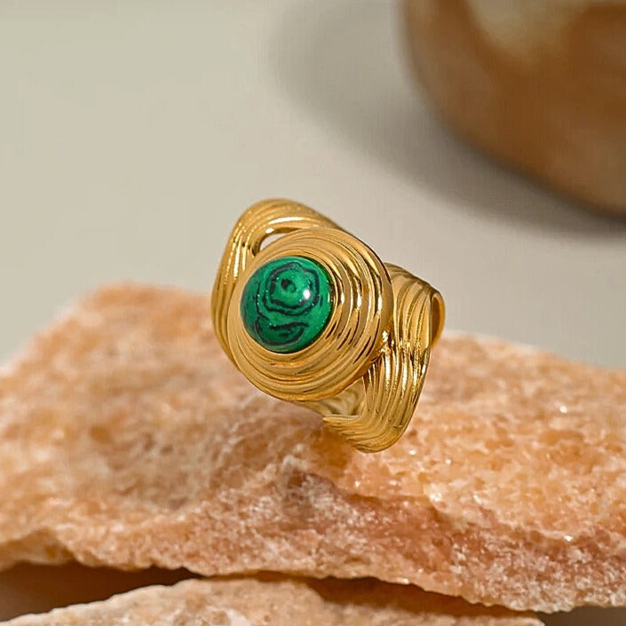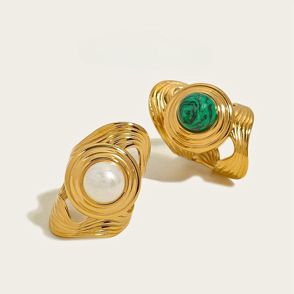 Elevate your look with these bold, 18K gold-plated rings. Featuring natural stones, sculpted textures, and a wide-band design, they blend modern elegance with timeless statement style.